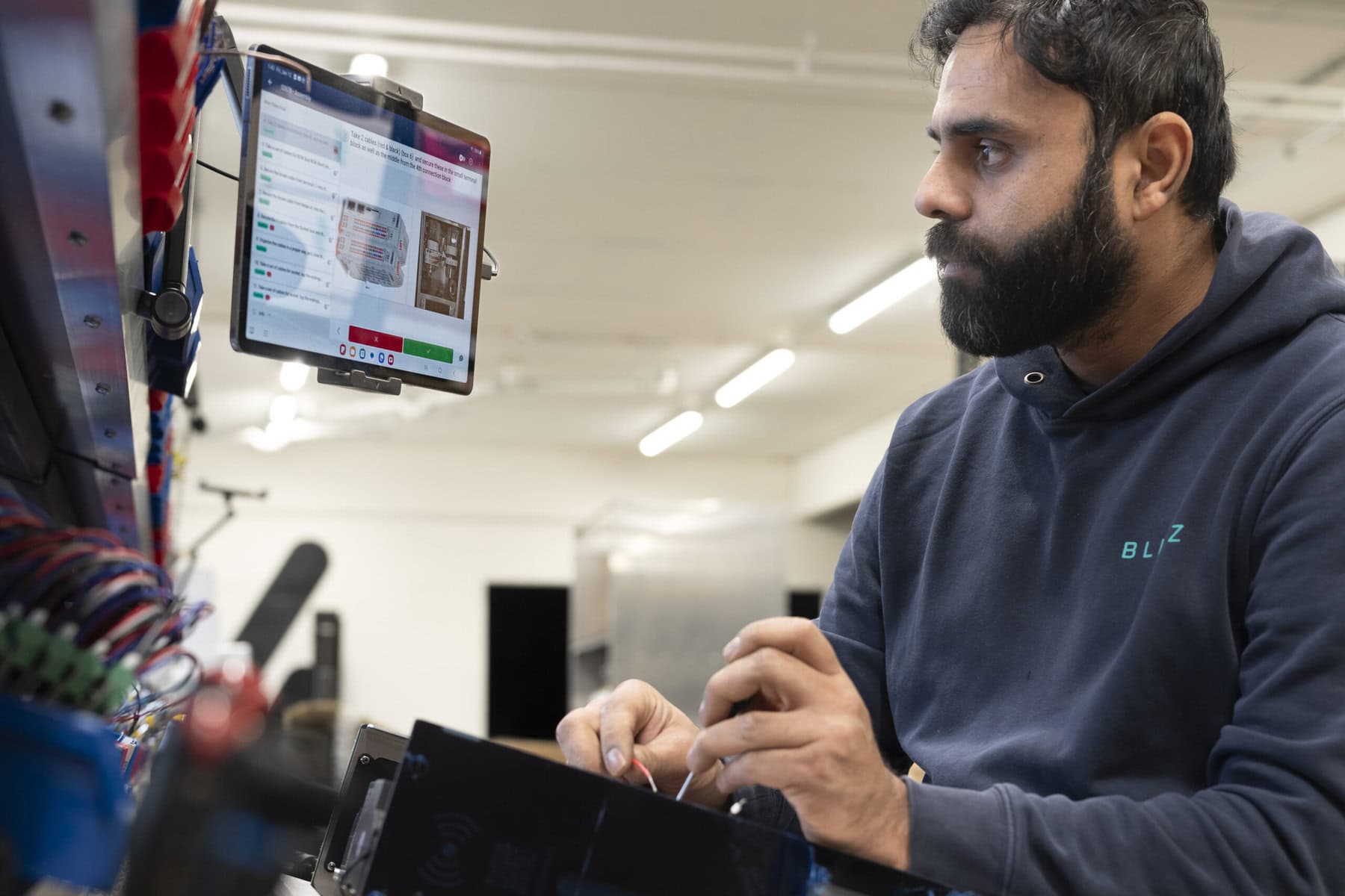 Each instruction set at Blitz covers a specific work post: assembly, testing, or packaging. Each charging station model has its instruction cluster, divided into sub-instructions for particular tasks like installing a cover panel. These instructions serve as a “single source of truth,” allowing operators to consult a unified set rather than scattered sources. Operators access instructions by scanning a serial number on a charging station component, automatically displaying the correct instructions on their device, ensuring precision and consistency.