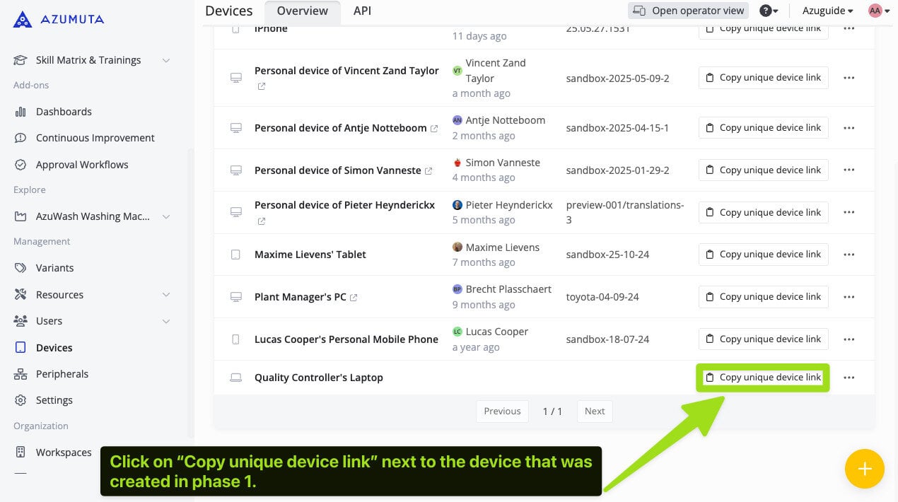 - Klicken Sie auf "Eindeutigen Geräte-Link kopieren" neben dem Gerät, das in Phase 1 für Ihre Betreiber erstellt wurde. Die eindeutige Geräteverknüpfung wird dann in Ihre Zwischenablage kopiert.