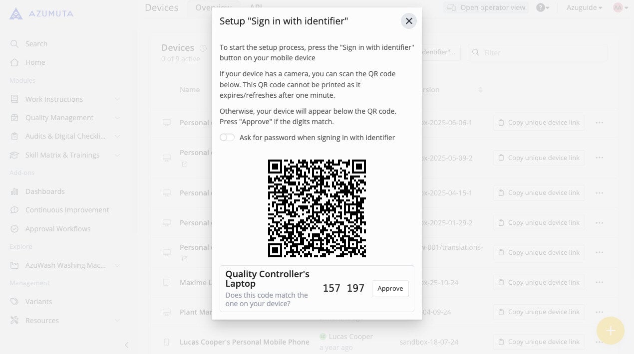 - Es gibt zwei mögliche Methoden zur Authentifizierung des Geräts, das von Ihren Betreibern verwendet werden soll. Die erste Methode ist das Scannen des Barcodes wie in der Abbildung unten gezeigt, unter Verwendung des Geräts, das von Ihren Bedienern verwendet wird (Sie können diese Methode nur verwenden, wenn das Gerät über eine Kamera/einen Barcode-Scanner verfügt). Die zweite Methode besteht darin, neben den sechsstelligen Zahlen auf "Genehmigen" zu klicken (Wenn Sie diese Methode verwenden, vergewissern Sie sich bitte, dass die Nummern genau mit den Nummern in Schritt Nr. 5 übereinstimmen). Wenn Sie außerdem möchten, dass sich die Betreiber, die dieses Gerät benutzen, mit ihren Identifizierungscode und ihr Passwort, sollten Sie einschalten die Option "Bei der Anmeldung mit Kennung nach dem Kennwort fragen" zu aktivierenwie in der nachstehenden Abbildung gezeigt.
