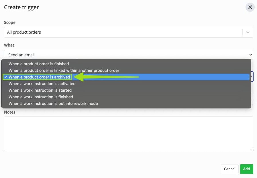 We’ll start with the first one. With this trigger, whenever any product order in your workspace (or a product order from a specific article category) is archived, you can trigger the following events to occur: