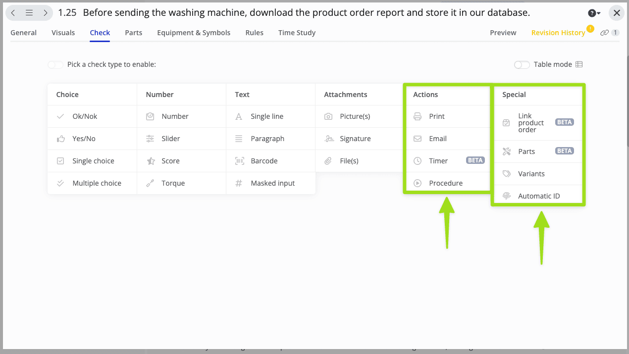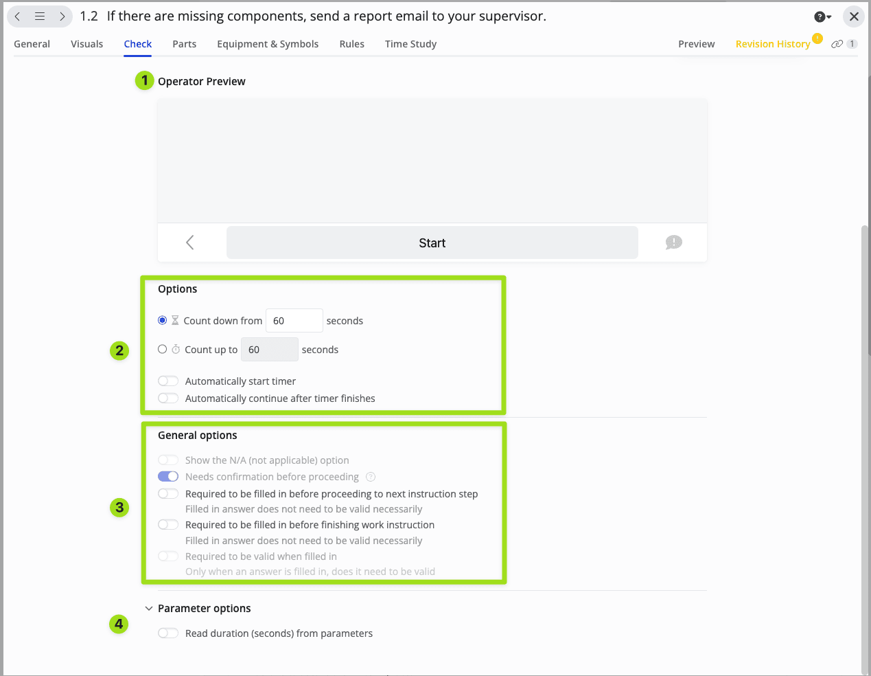 The timer check is designed to standardize the time spent on specific steps, ensuring operators don’t rush critical processes, thereby maintaining consistency and quality in operations. In addition, it can also be used to prevent operators from spending too much time on a single task.