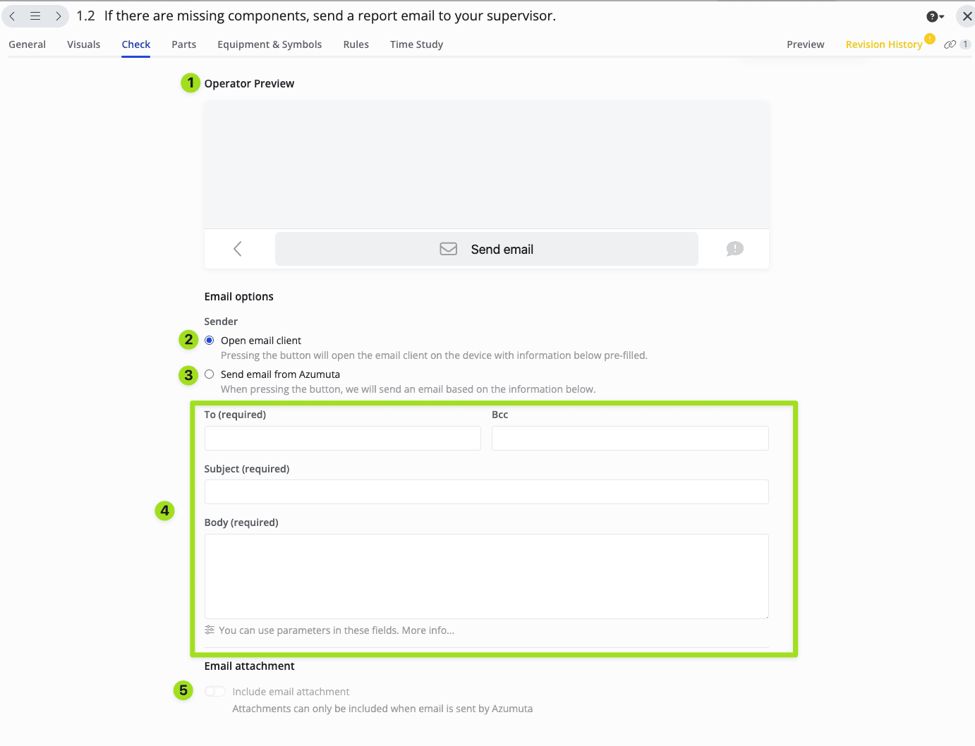 What happens on this check: You can set up a “Print” button on a work instruction step. When an operator taps on it, it’ll direct them to send an email with pre-made content to a predetermined receiver. This allows email reporting to happen in a blink of an eye. Here’s how it works: