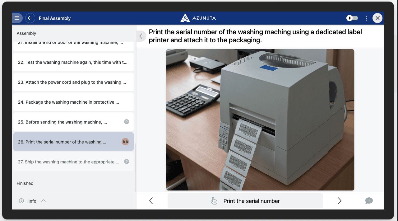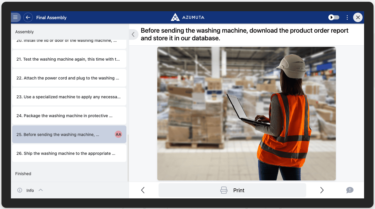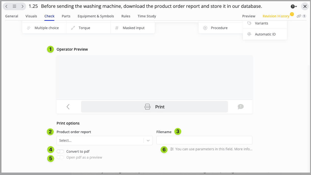 What happens on this check: You can set up a “Print” button on a work instruction step. When an operator taps on it, the operator’s device will automatically download a product order docx report that you have previously set up. This guide allows your operators to access any product order report in an instance. Here’s how it works: