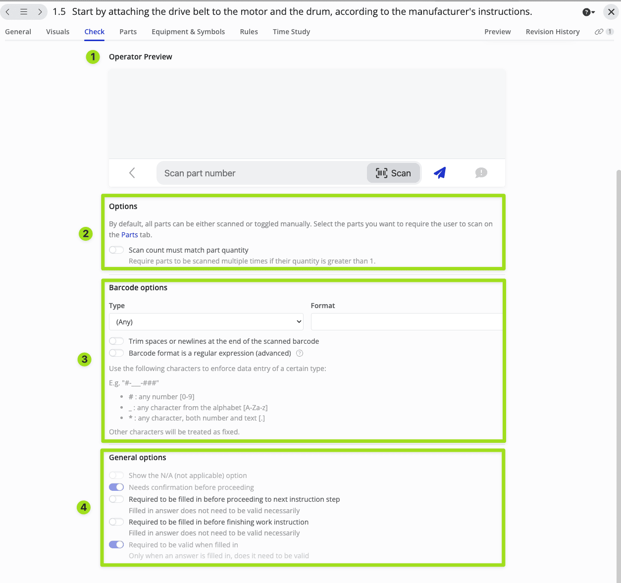 - Select whether the operator’s part count must match the quantity mentioned in the work instruction step.
