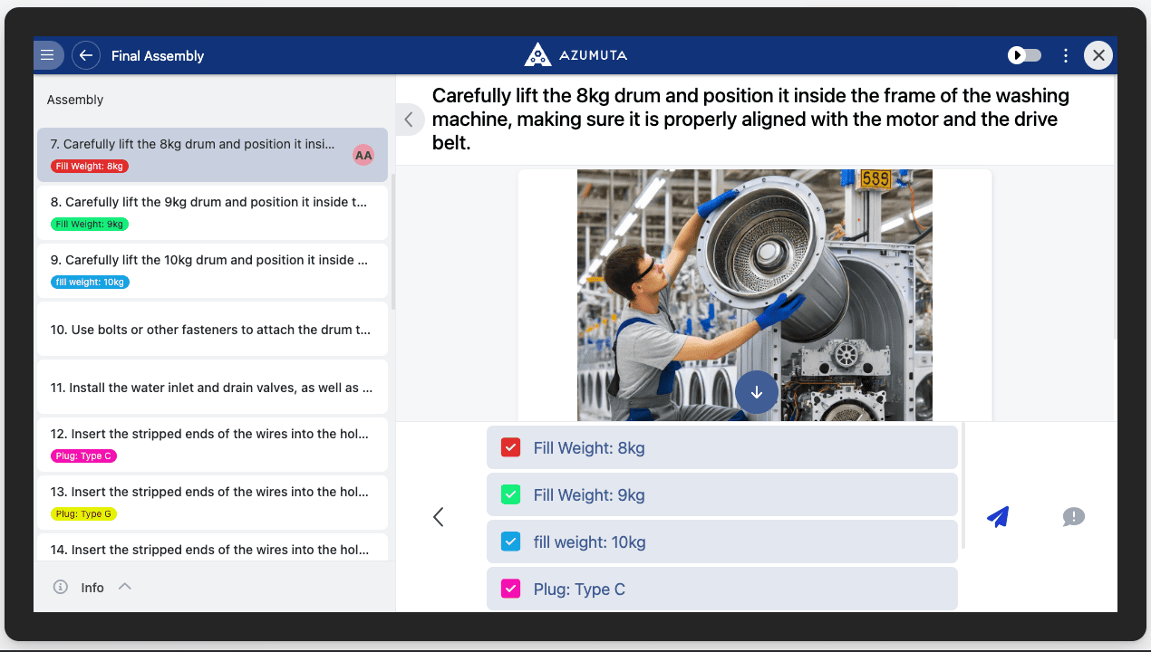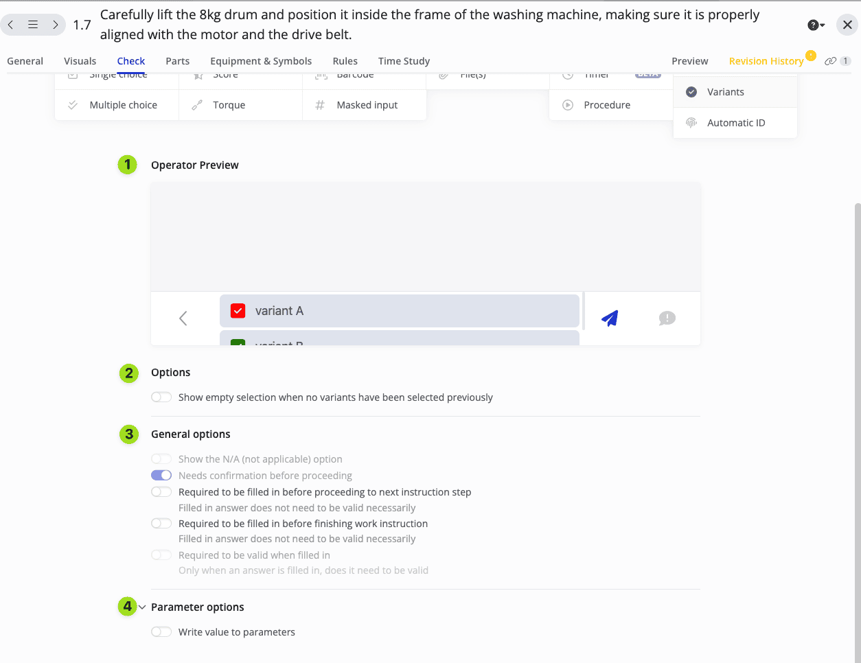 - Operators can quickly adapt to changes in production requirements by switching between different variants quickly and easily. Showing & hiding variants in a work instruction can be done in a matter of seconds.