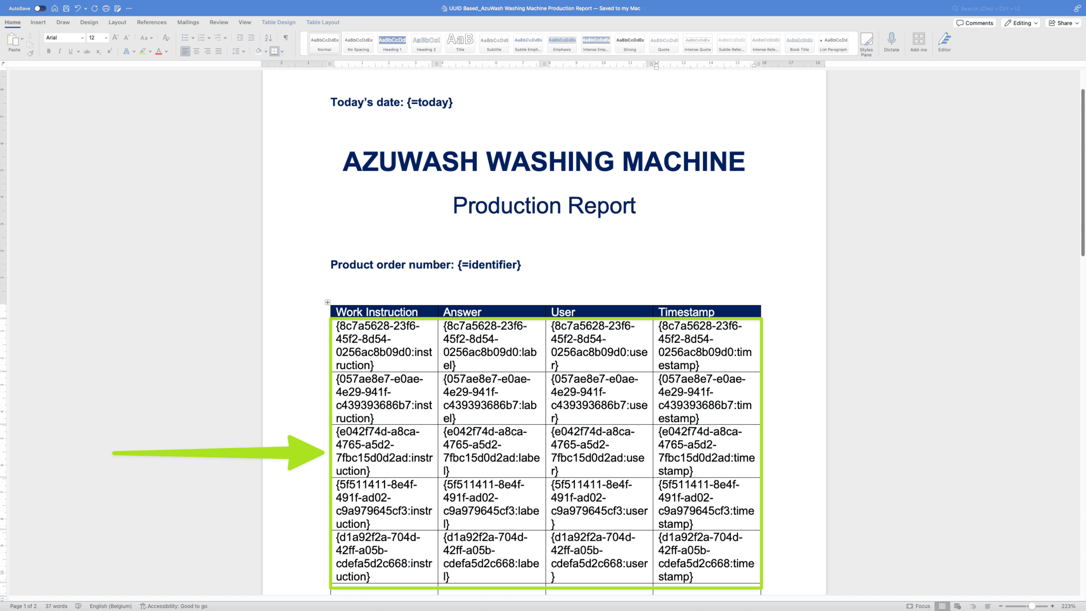Besides using standard answer tags, you can also use Universally Unique IDentifiers (UUIDs) on a docx report. Using a UUID allows you to input data from any individual work instruction step with a product check that you desire, in any order – into your docx report. This gives you much more flexibility than basic answer tags.
