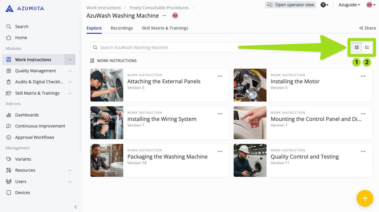 Azumuta now offers the card view, alongside the classic list view, in displaying work instructions, folders, and article categories. The card view resembles how items are displayed in the Azumuta App.