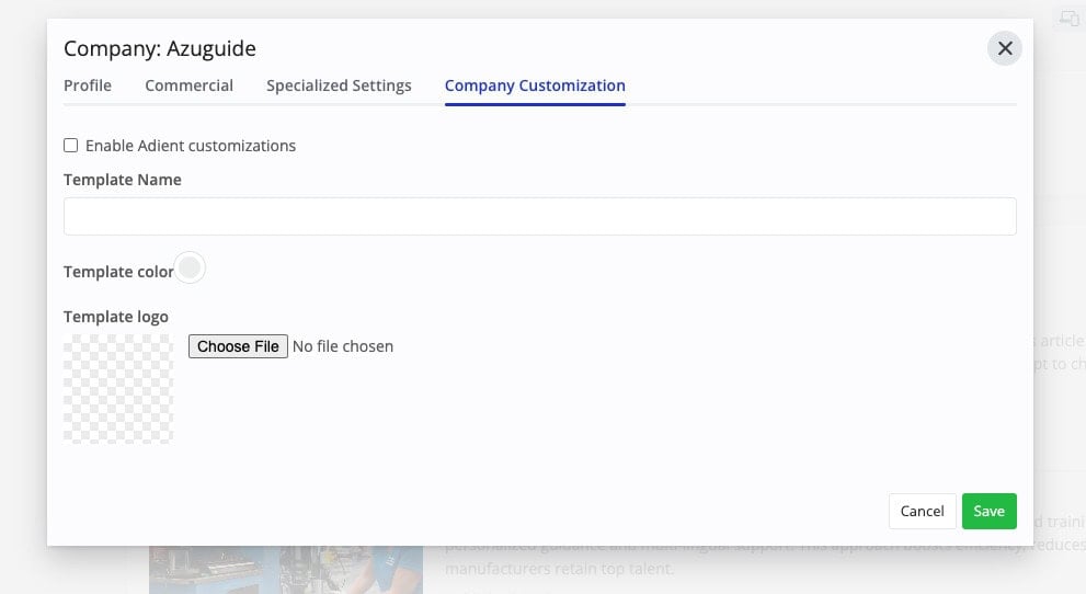 We’ve added a new feature: The ability to add your company logo and corporate color scheme on PDF templates. A PDF template is used to print an Azumuta work instruction.