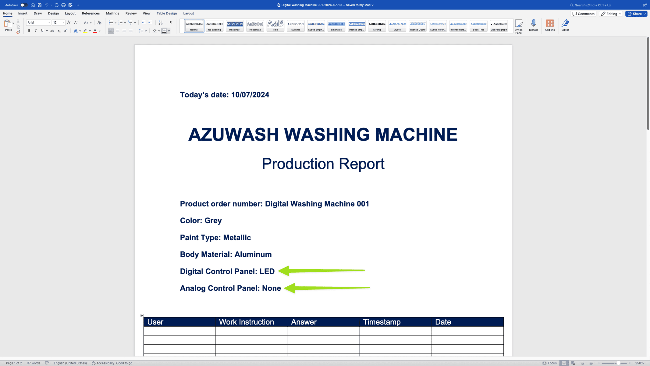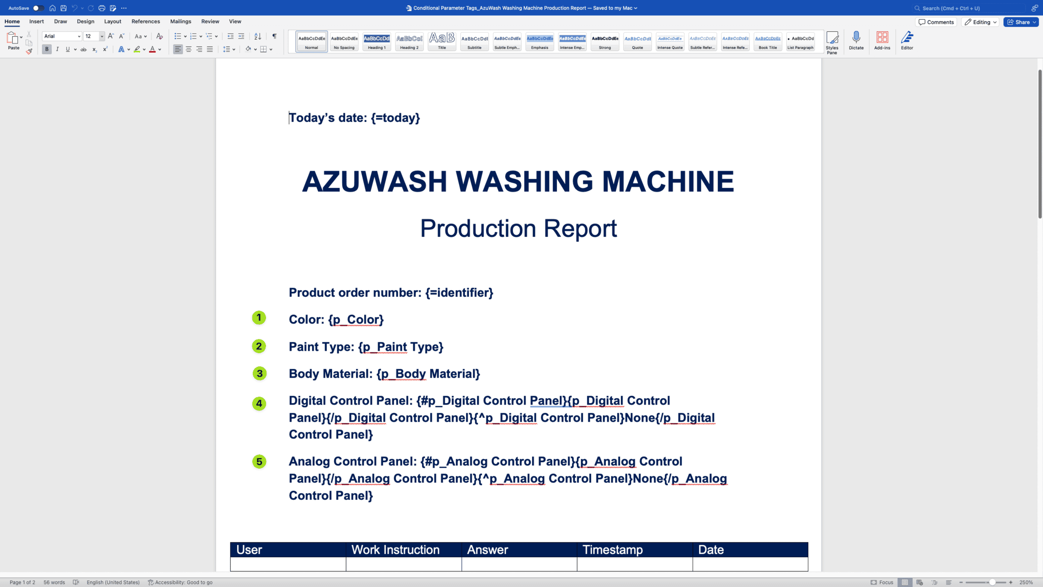 This factory uses the same docx report template for the digital washing machine and the analog washing machine (as they fall still under the same article category: washing machine). Thus, all four parameters will still exist on each docx report.