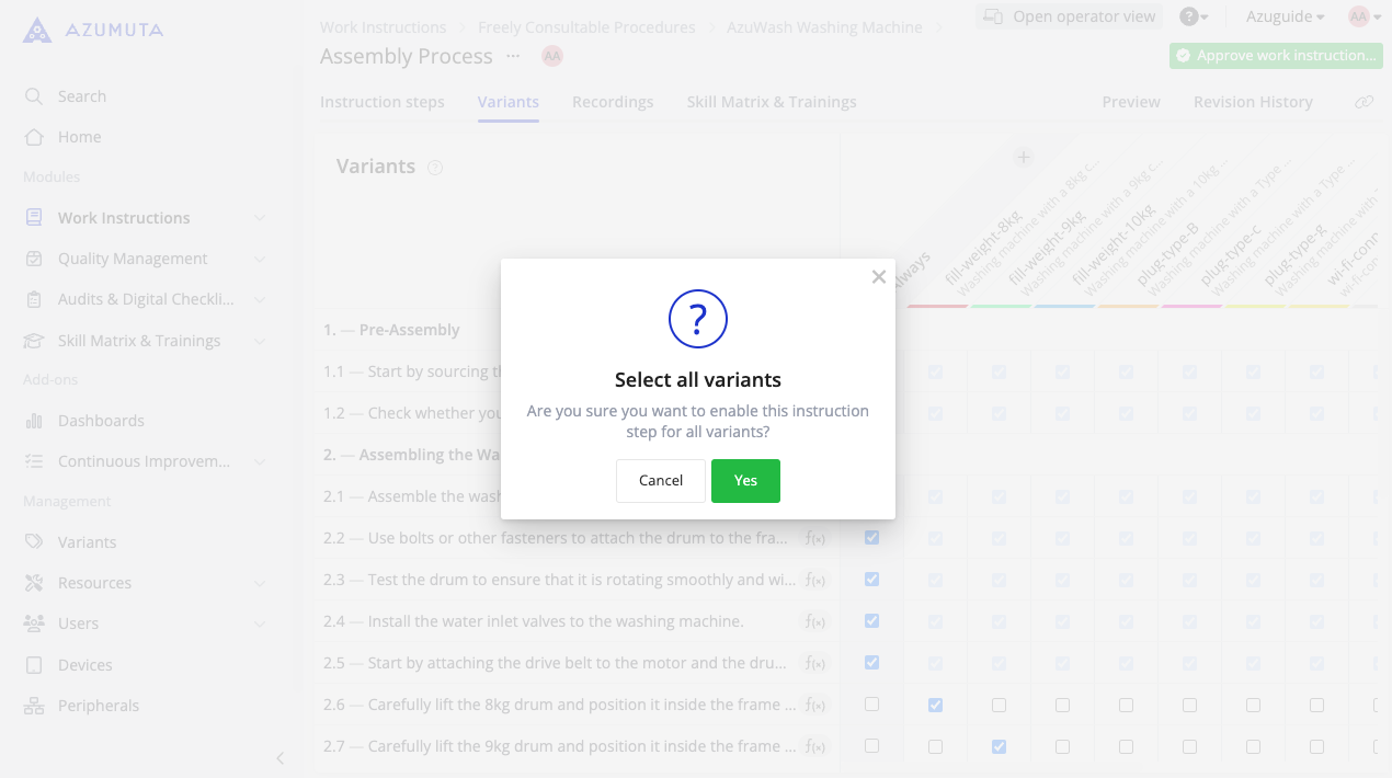We’ve added a pop-up confirmation menu to the work instruction variant configurations tab.