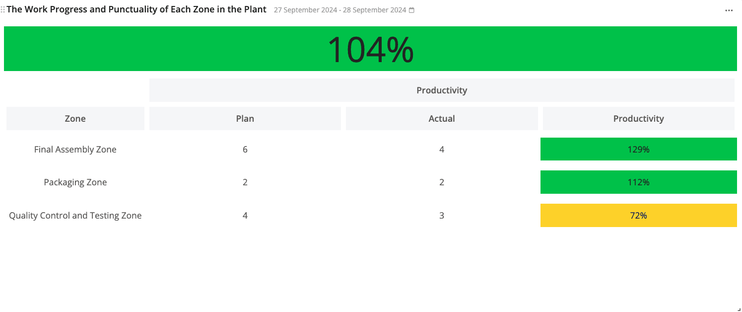 - This number represents the average on-time performance of all zones that are displayed on this widget. We will explain more about how on-time performance is measured on No.5. Moreover, if the on-time performance goes below 100% and the tolerated time limit (we will explain how to adjust the time tolerance in the guide section below), then the productivity bar will turn yellow.