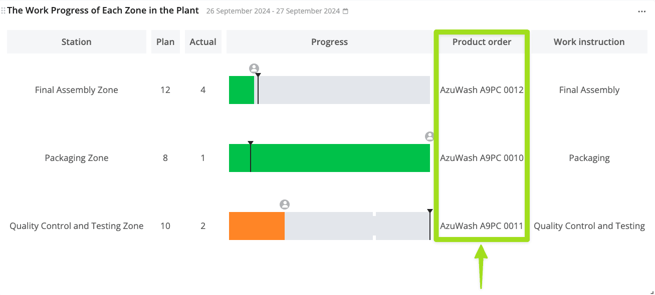 - The Product order column shows the name of the product order that is currently being worked on in each selected zone.