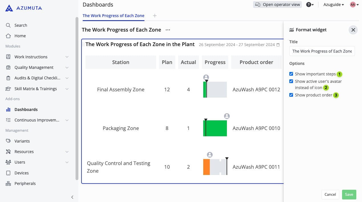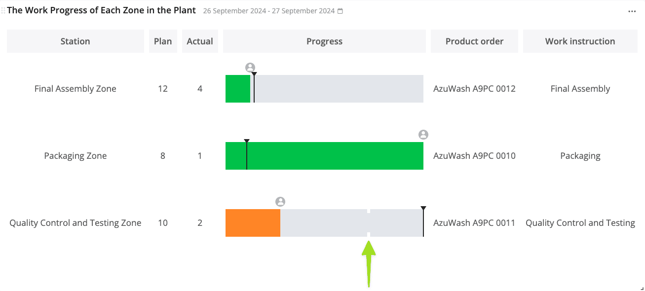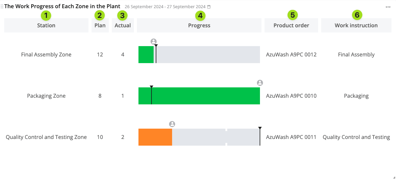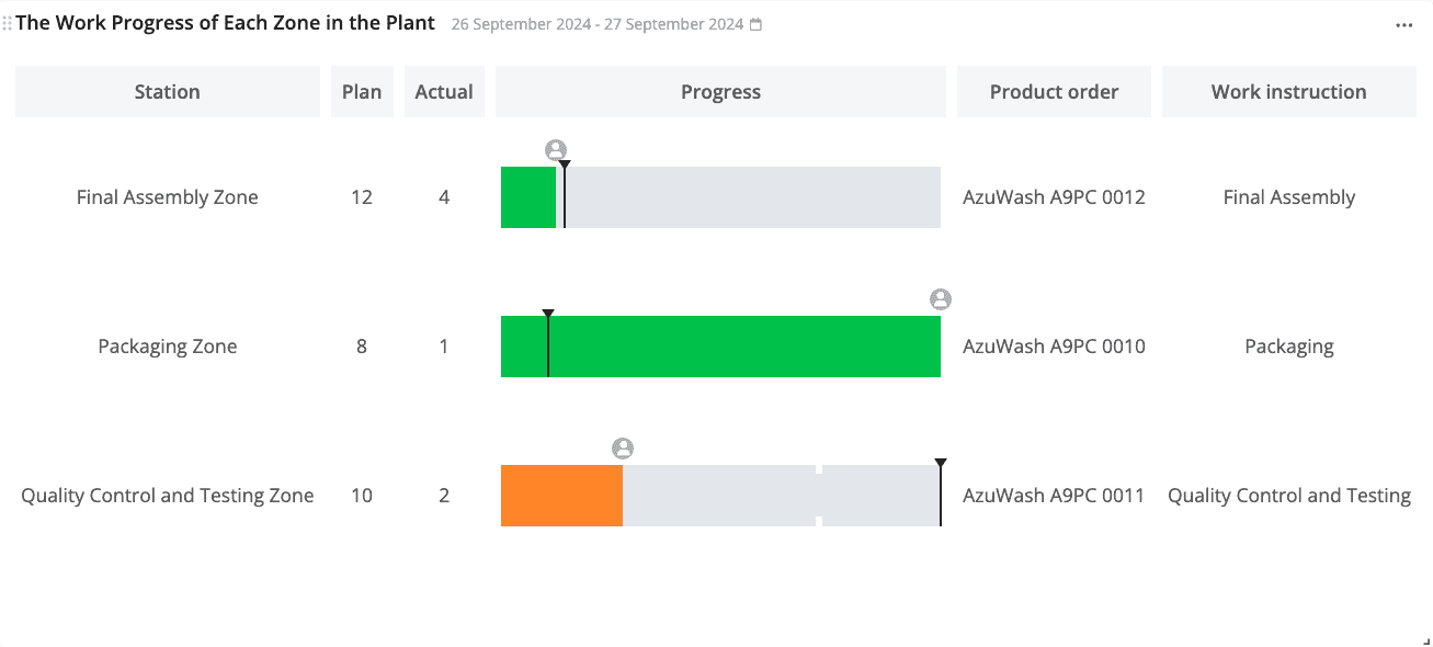 This widget displays the progress of the execution of product orders within selected zones and the completion rate of a work instruction from each selected zone that is currently being worked on (in real-time) in comparison to each work instruction’s pre-determined time study.