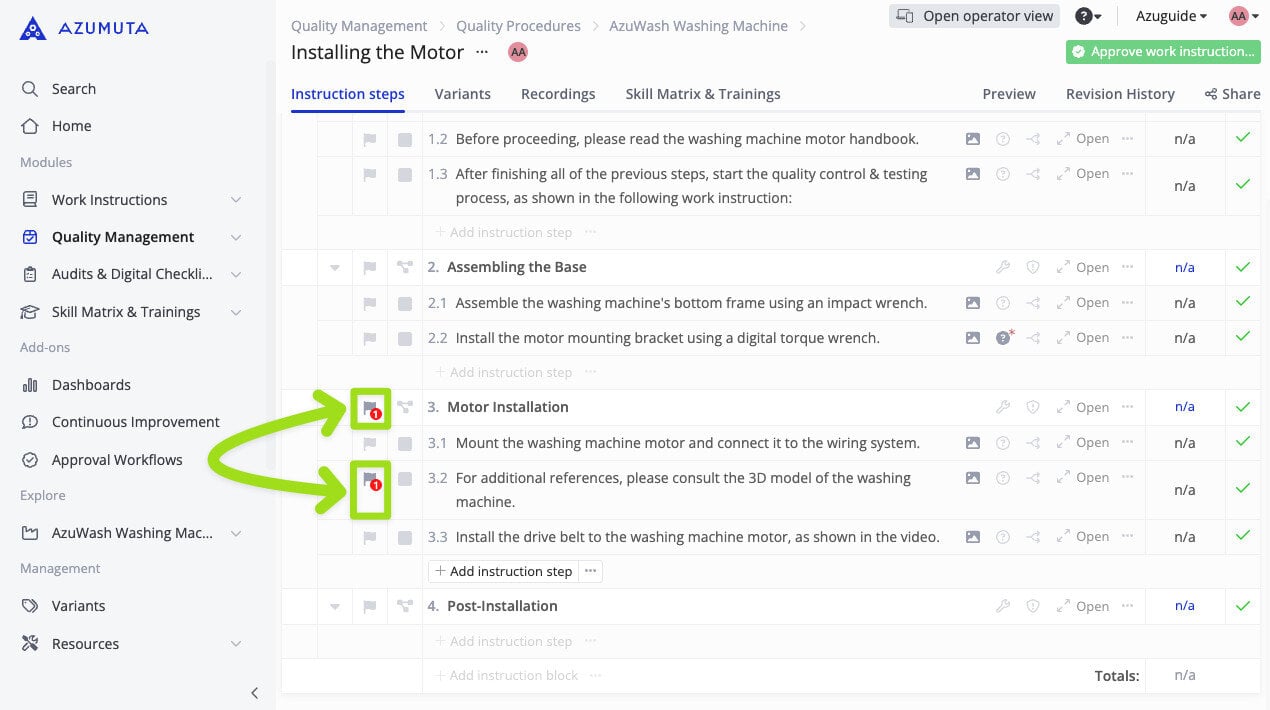 - Select whether to display the andon issue from this andon board on the related instruction step & instruction block on the work instruction editor, as shown in the image below (please pay attention to the highlighted flag icons):