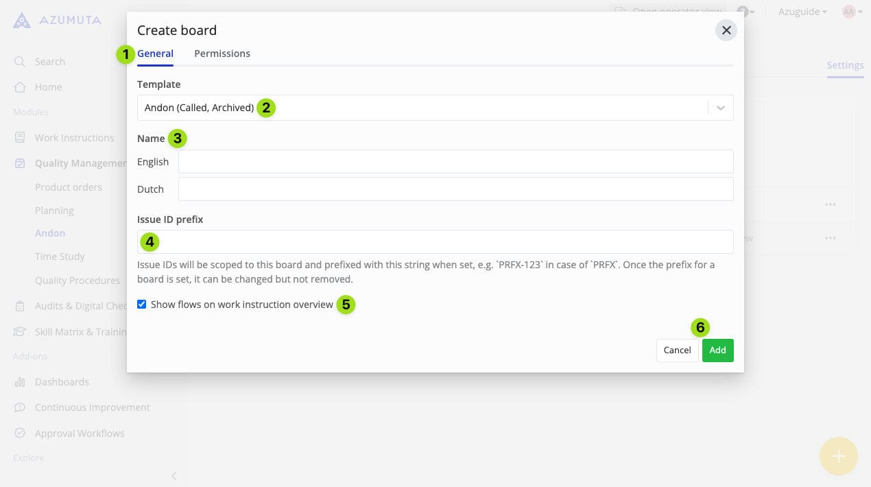 When creating a new andon board, the general tab is the first tab that you will see.