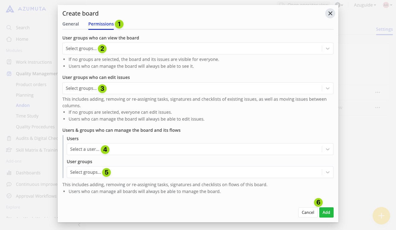 - Select which user group(s) can manage this andon board and all andon flows that fall under it.