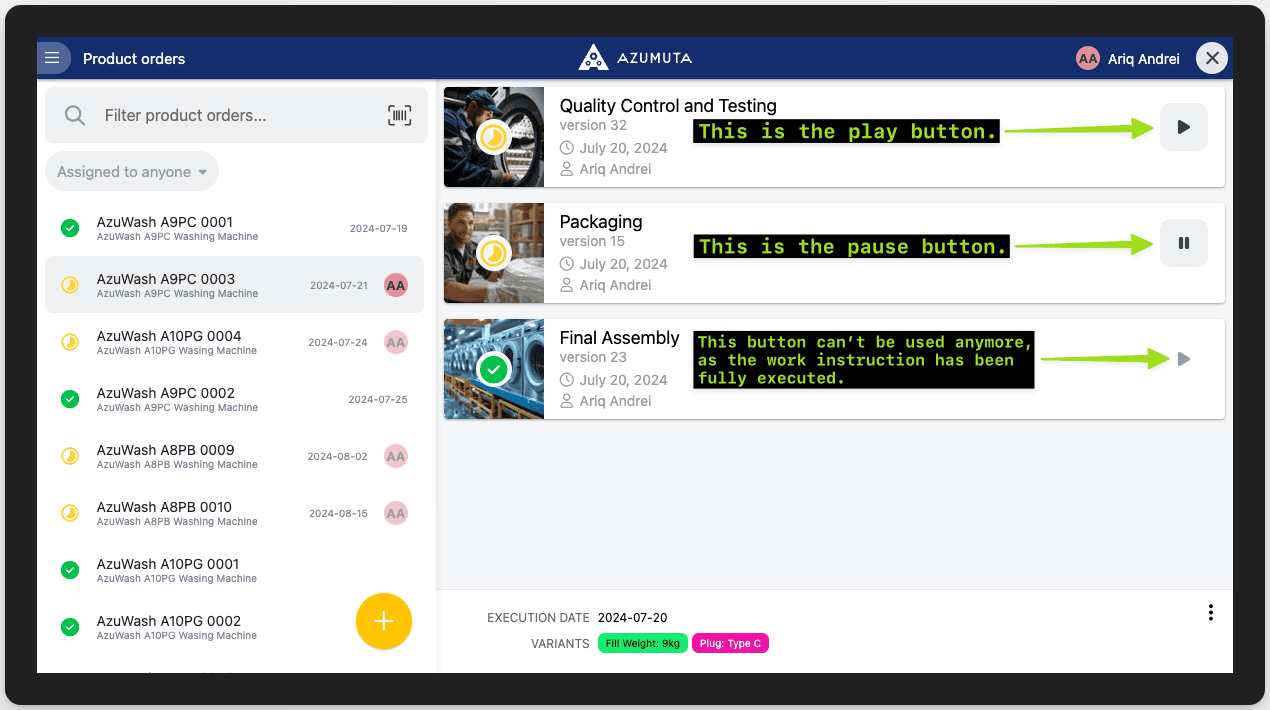 - If you tick this, then you will see a play/pause button on each work instruction that is linked to a product order. Thus, you can continue/pause a work instruction by just clicking on this button – without entering that work instruction. Please take a look at the image below to see where this button lies: