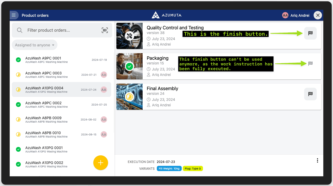 - If you tick this, then you will see a finish button on each work instruction that is linked to a product order. Thus, you can finish a work instruction by just clicking on this button – without having to enter the work instruction. However, you can’t use this button if there’s a mandatory product check that has to be filled. Please take a look at the image below to see where this button lies: