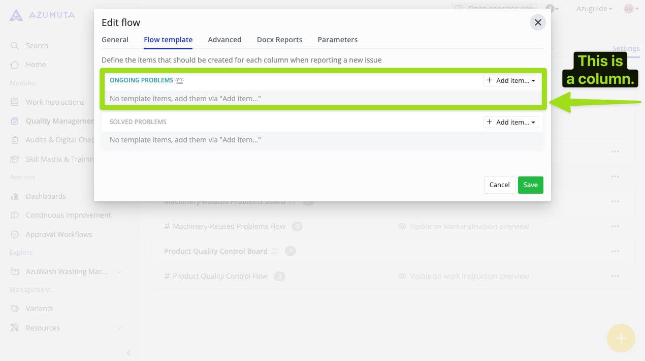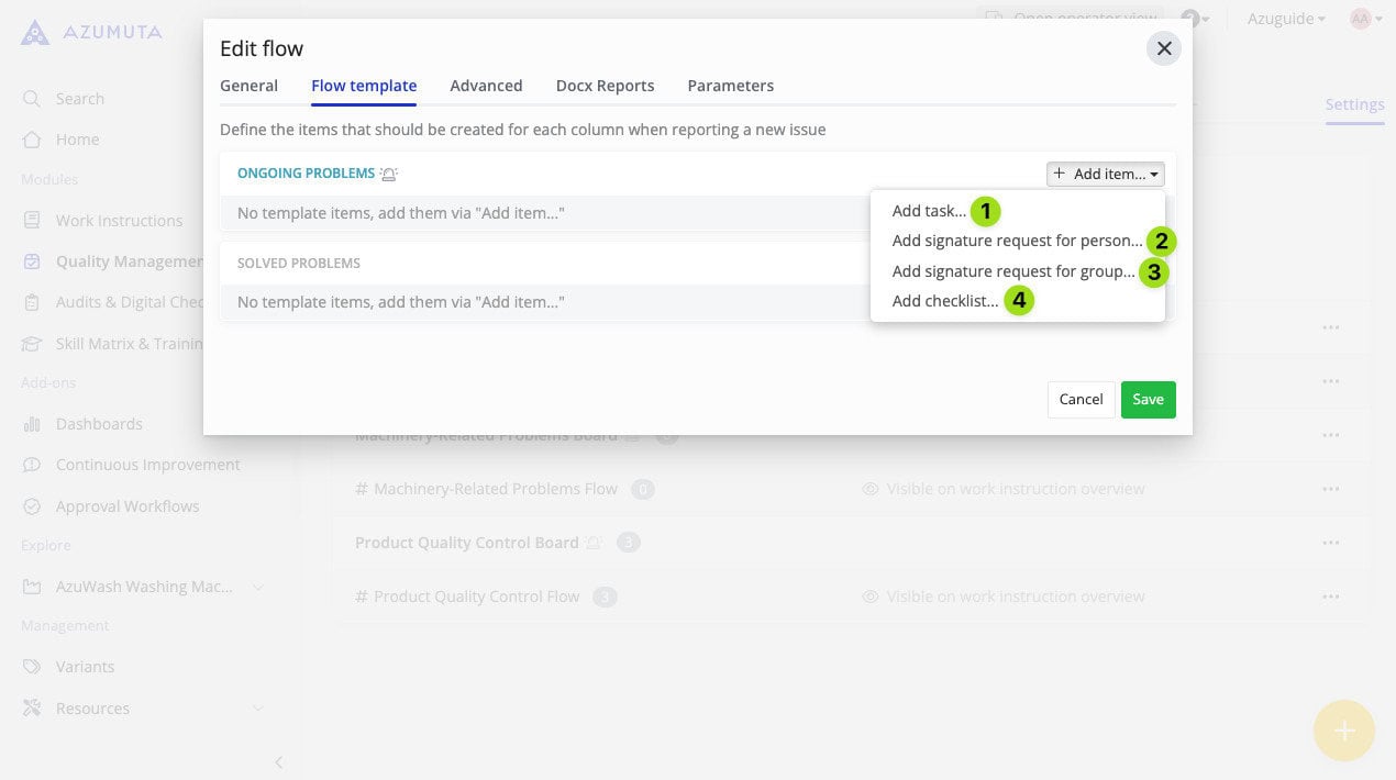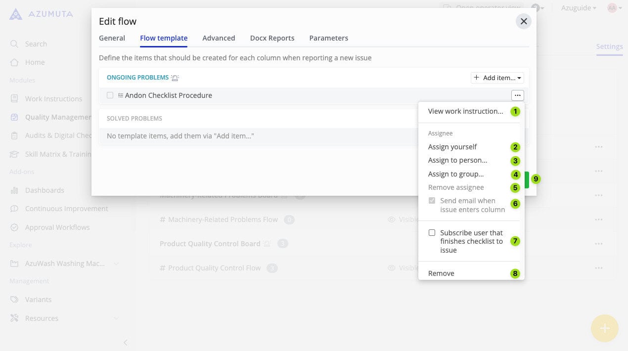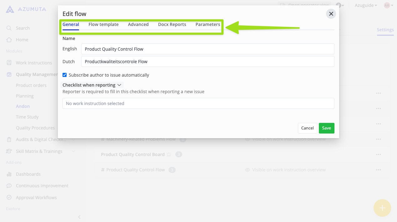 You can add parameters to an andon flow. These parameters will be listed on all andon issues that fall under this andon l flow’s umbrella, as well as on all checklists that are linked to those andon flows.