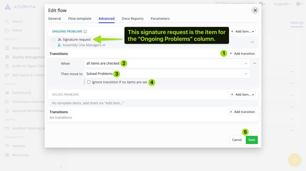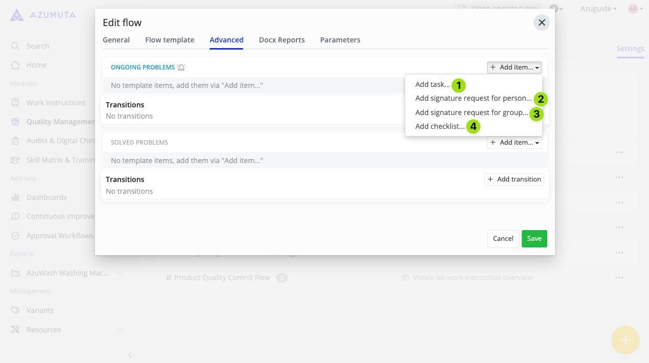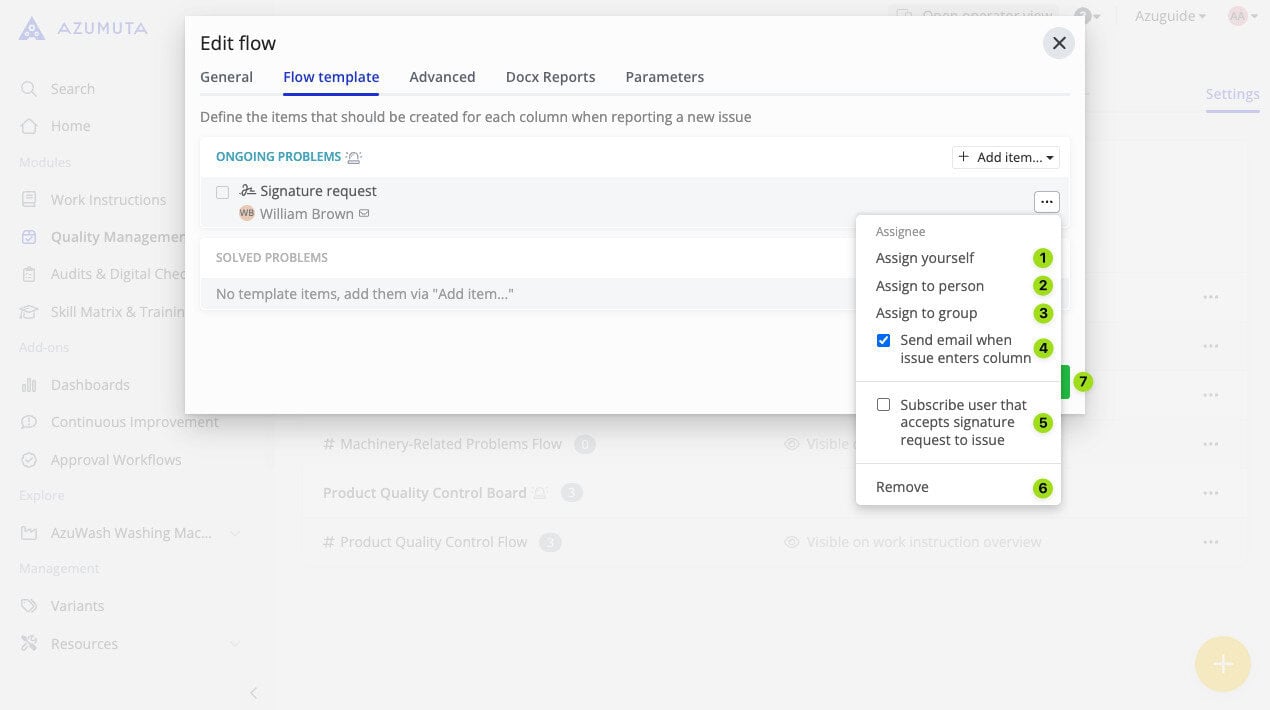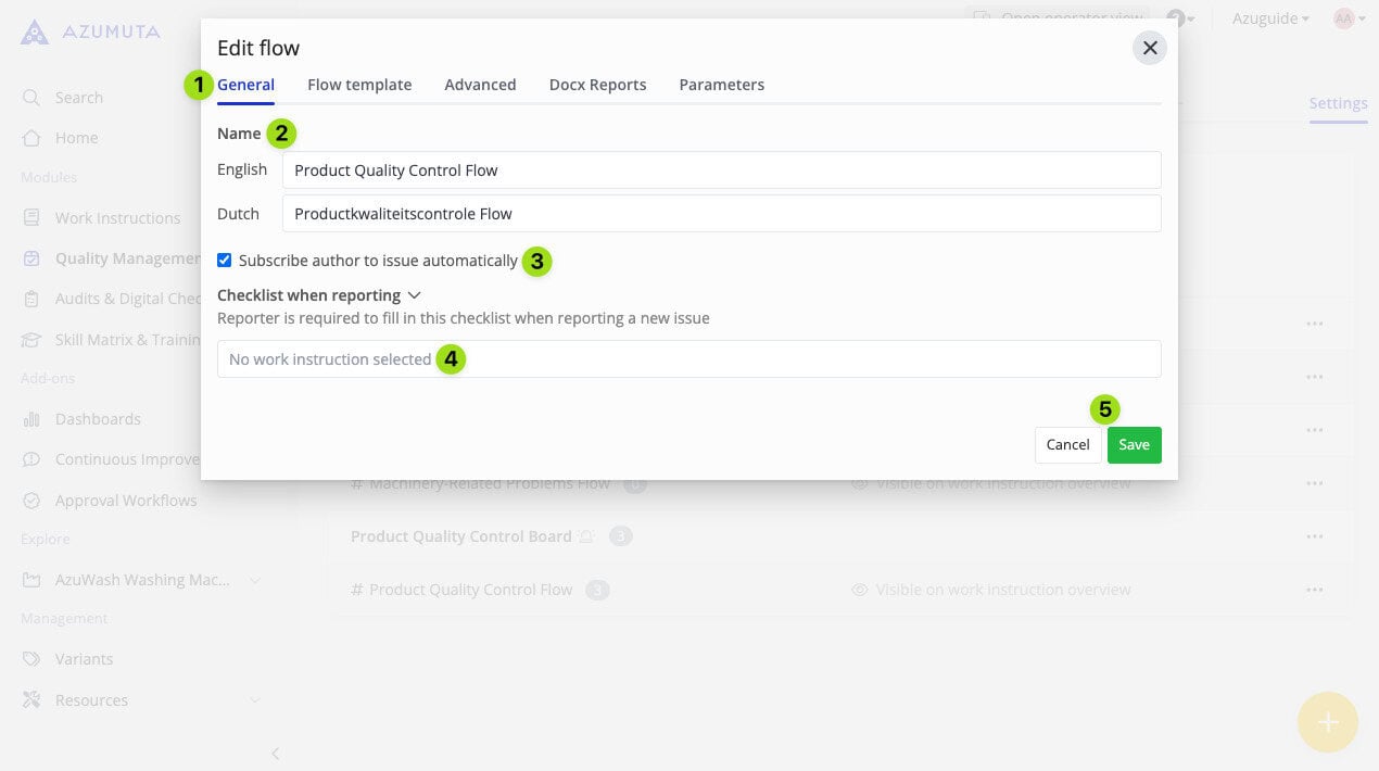 You can add parameters to an andon flow. These parameters will be listed on all andon issues that fall under this andon l flow’s umbrella, as well as on all checklists that are linked to those andon flows.
