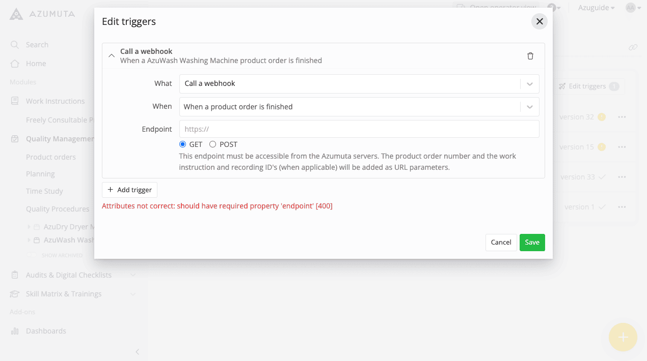 To make sure the webhook works, the Azumuta servers need access to the configured endpoint. The product order number and, if applicable, the work instruction and recording ID’s are included as query parameters (for a GET request) or as JSON (in case of a POST request) in the webhook.