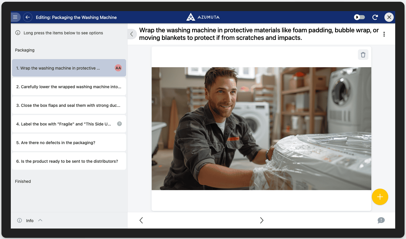 Within Azumuta you can add (multiple) photos to a given work instruction directly from the app/operator view. Adding photos via the app to a work instruction can be done in the following way: