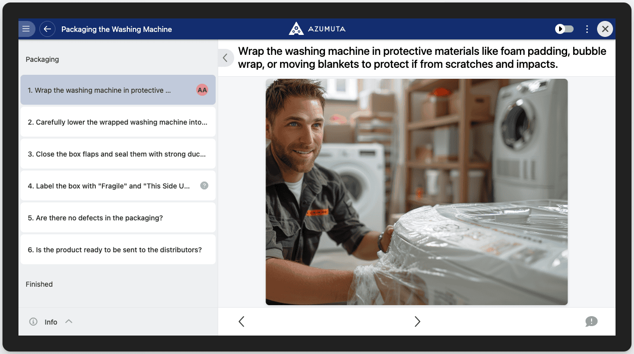 This is how a work instruction step with a single image (added from the app) will appear on the operator’s screen: