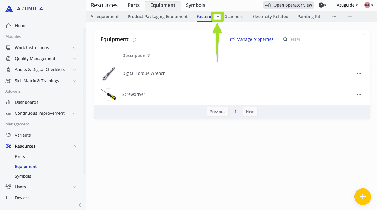 - Click on the three-dot icon next to the equipment that you wish to edit.