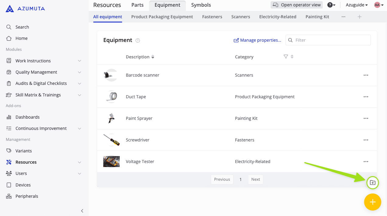 - Click on the plus icon next to existing equipment categories (if there are existing equipment categories already) or next to “All equipment” (if there are no existing equipment categories yet).