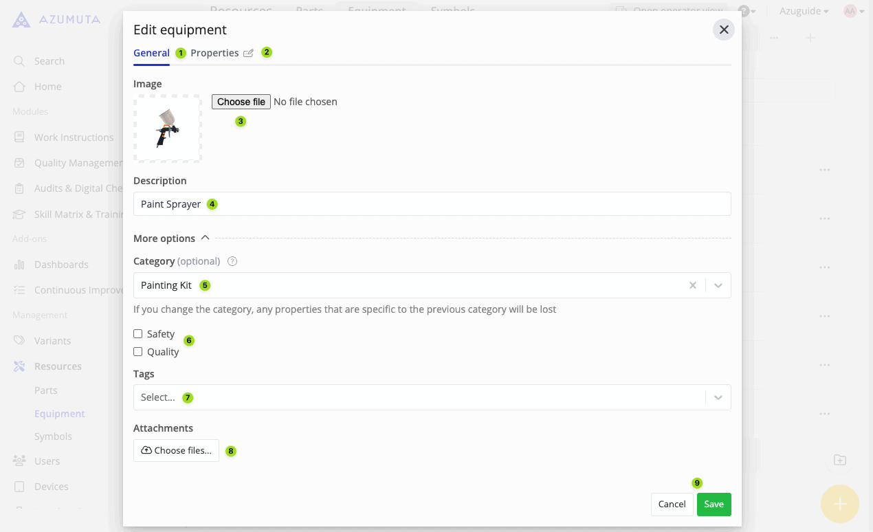 - Choose whether the equipment is safety or quality-related (or both, or neither).