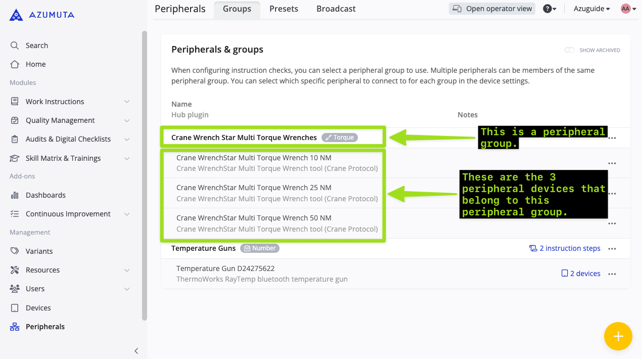 After adding peripheral groups and peripheral devices to your Azumuta platform, you can configure them to suit your needs.