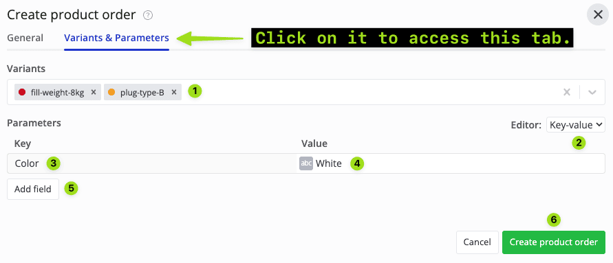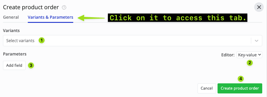 - If you want to edit the product order variants & parameters, you can click on the “Variants & Parameters” tab and enter the details there.