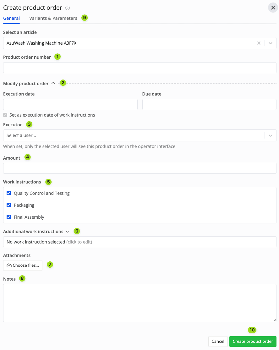 Note: While you can create a product order with this method, we recommend creating a product order based on an article or ERP input instead. That way, all instructions, variants, and parameters are already pre-configured. Thus, you don't have to manually configure them on your own each time you're making a new product order.