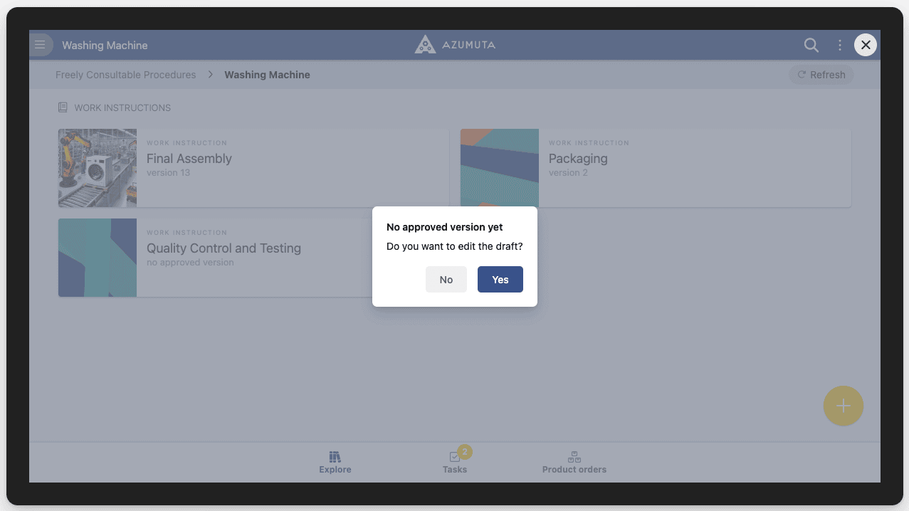 - There’s no official version of the work instruction yet: The operator will see theĀ “No approved version yet” pop-up message on their screen. The operator can’t use the work instruction.