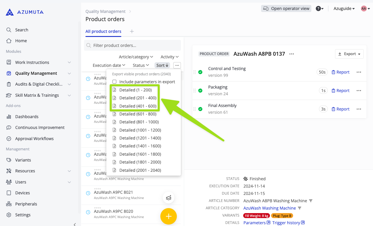 Besides the work instruction report and the docx report of a product order, you can also access its Microsoft Excel report. Additionally, you can also access the Microsoft Excel report for all product orders that exist in your workspace.