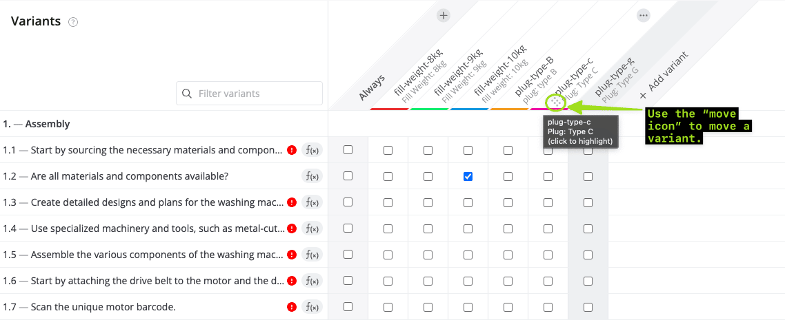 - Click, hold, and drag the variant to the desired place, and drop to move.