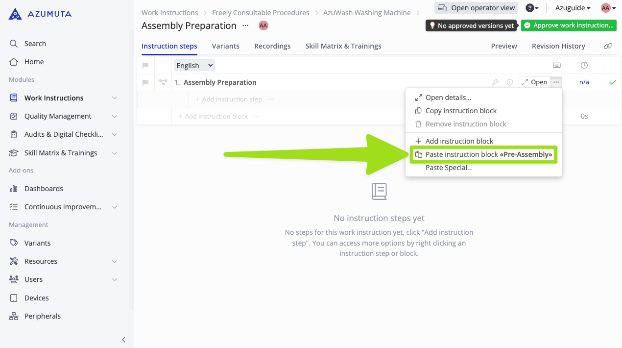 - Navigate to the targeted work instruction for where you would like to paste the instruction block to.