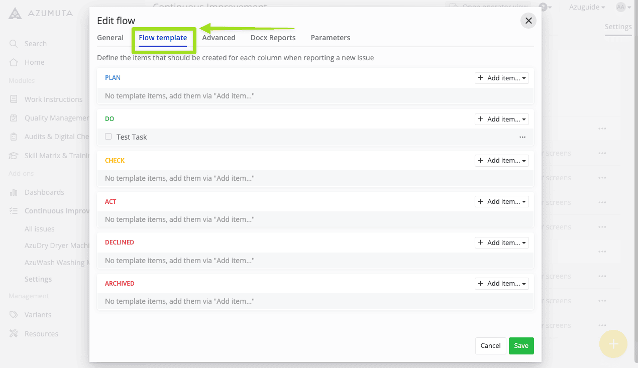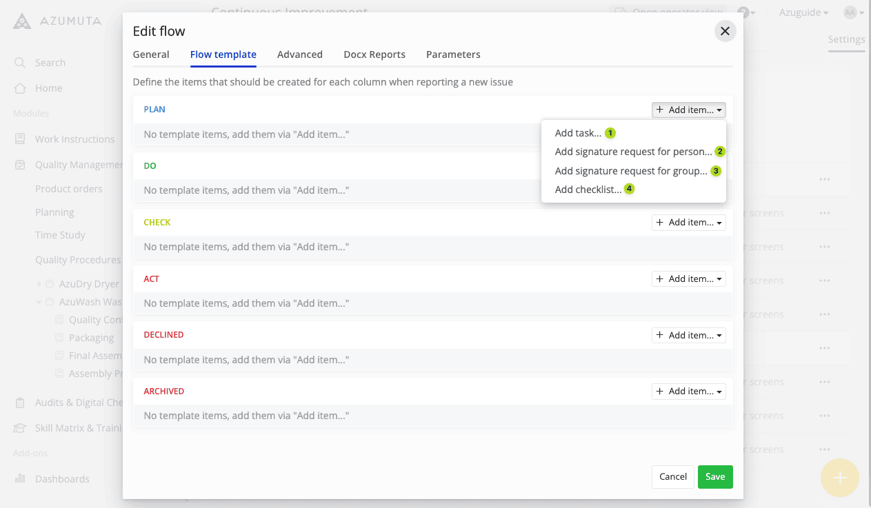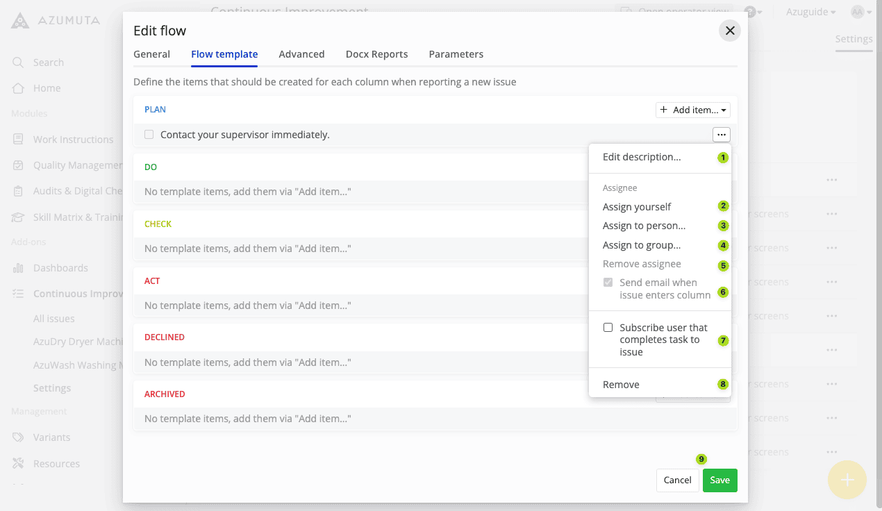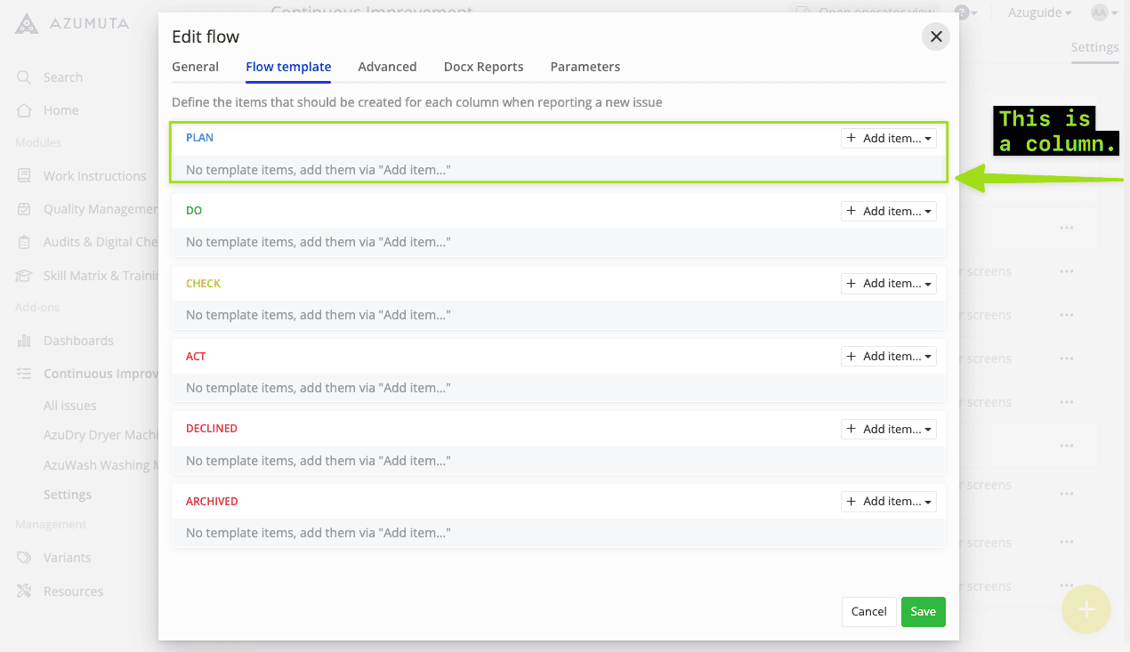 Note: Currently, there are 3 templates for improvement boards & improvement flows: PDCA, Kanban, and 8D. All 3 templates share the same editing settings. In this guide webpage, we will use the PDCA template in our examples.