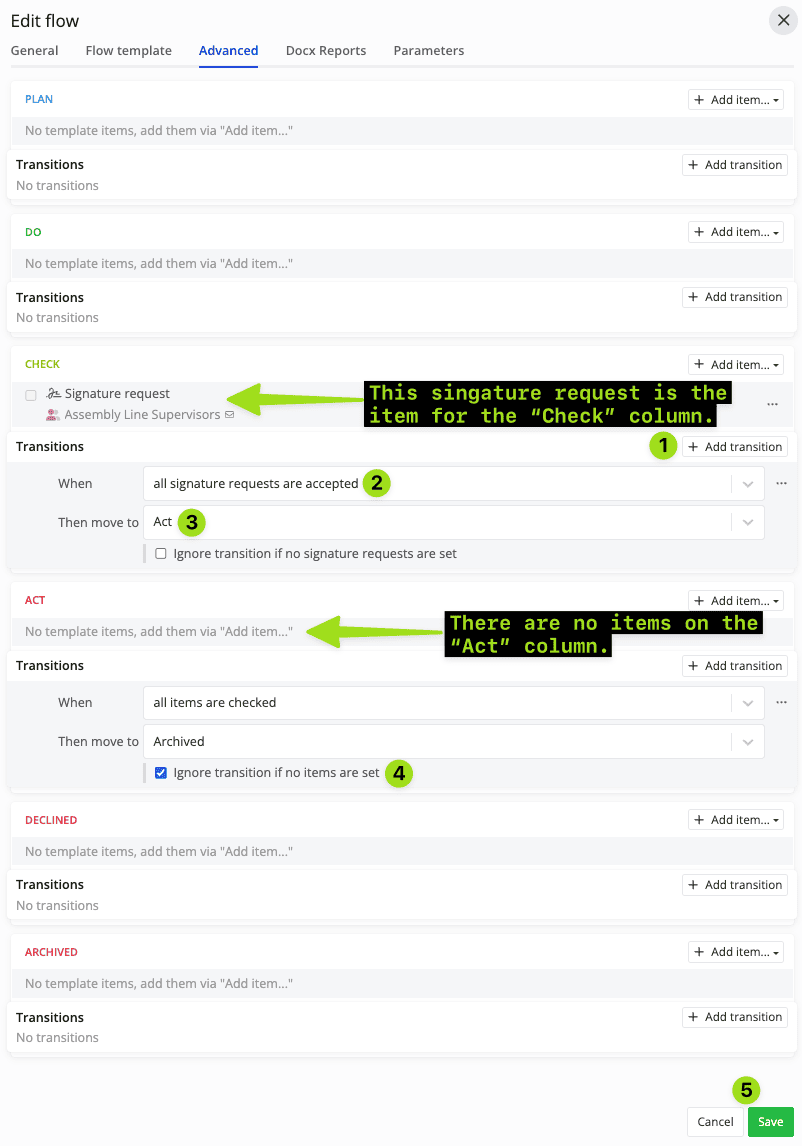 Meanwhile, a transition functions as a bridge between columns. A transition leads an item to another column, based on a pre-configured scenario.