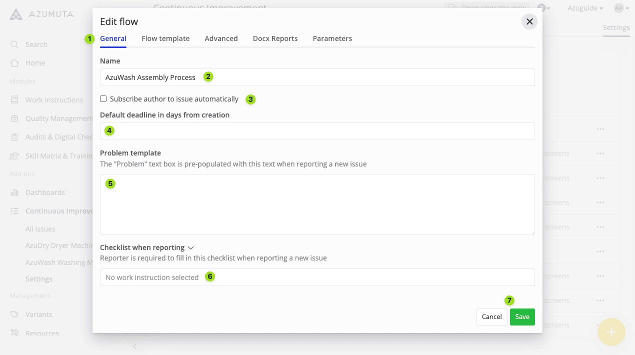 You can add parameters to an improvement flow. These parameters will be listed on all tickets that fall under this improvement flow’s umbrella, as well as on all checklists that are linked to those tickets.
