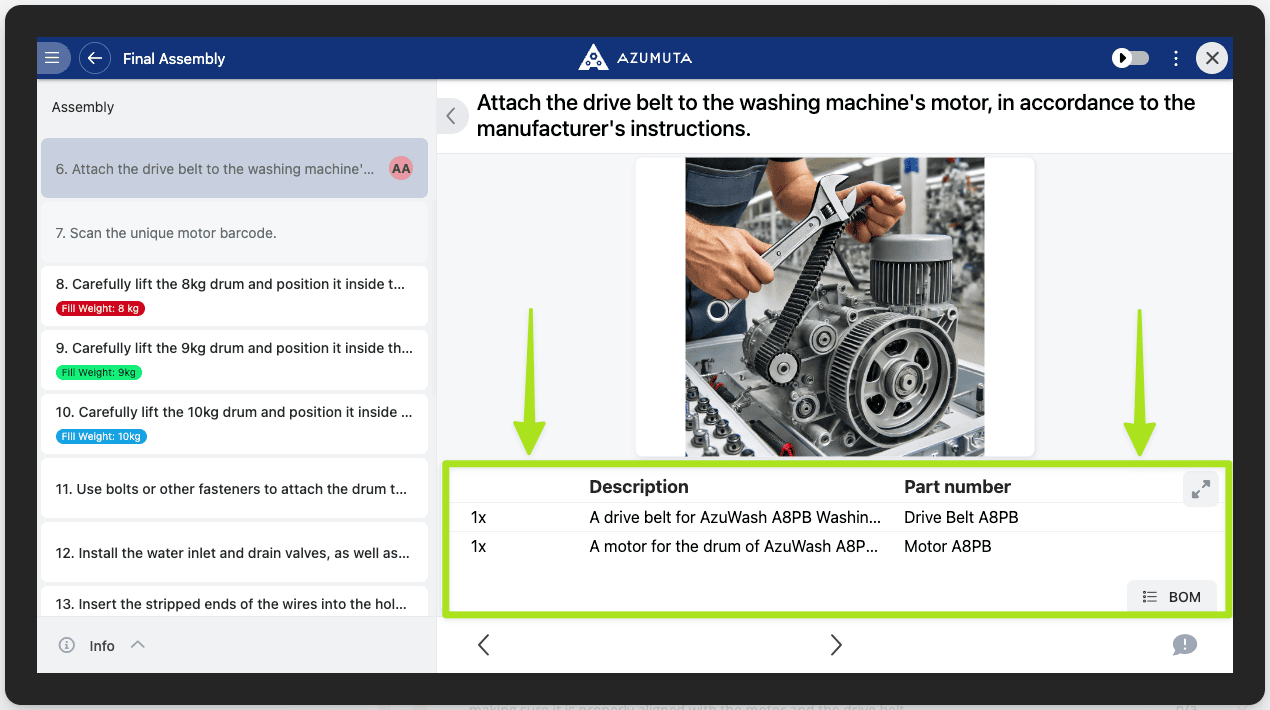 A product is generally consisted of numerous parts. In an Azumuta work instruction step, you can specifically mention which part(s) must be worked on/installed to the product. This will increase the precision of your work instruction and minimize ambiguity.