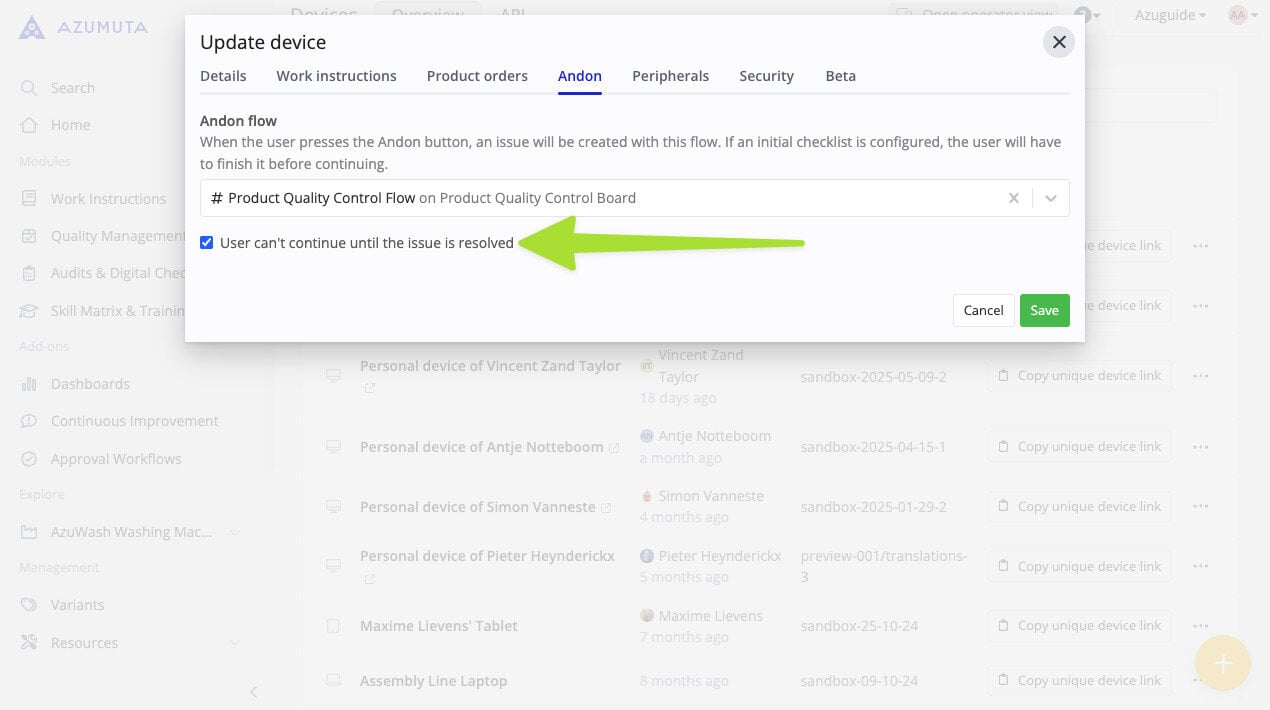 *Note: In the andon flow configurations, you can also set it so that the andon issue can already be marked as resolved if only one or several items are completed, rather than requiring all of them to be completed.