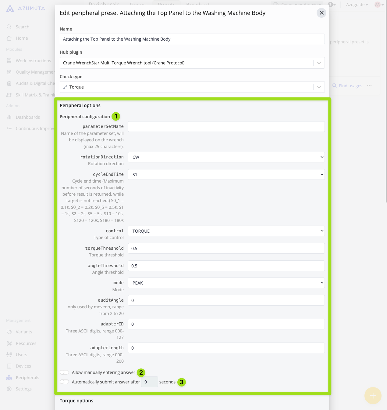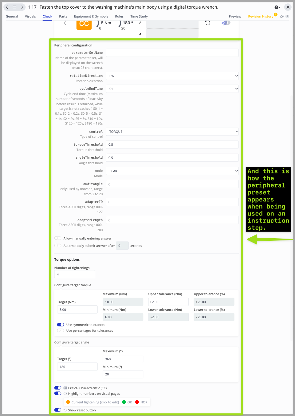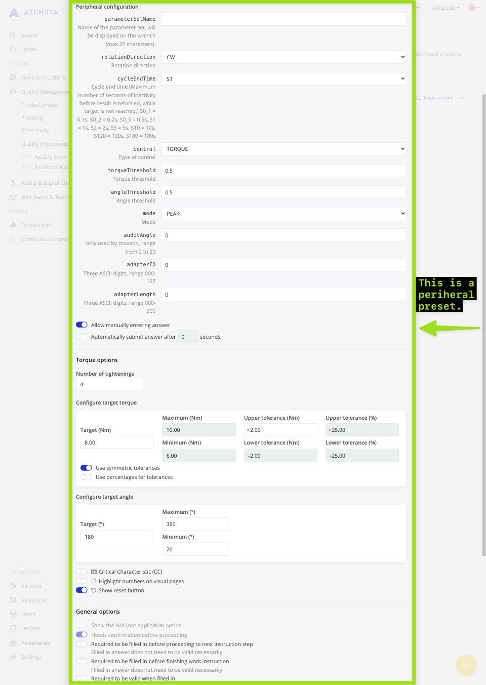 These options are the most important part of the peripheral presets. These options allow you to set the standards that must be followed by your operators when performing a torque check: