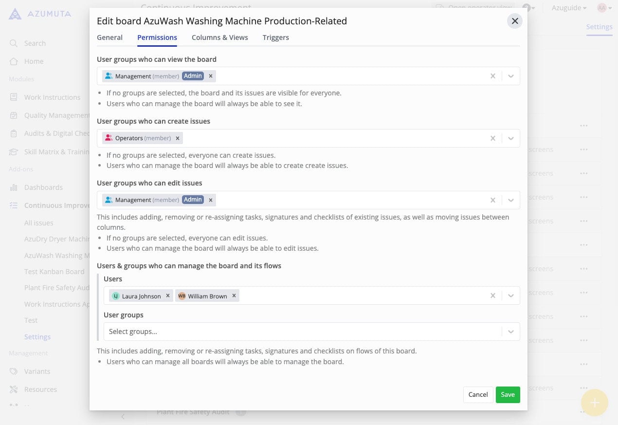 In this tab, you can adjust which user(s) and user groups(s) get to access, use, and manage a board.