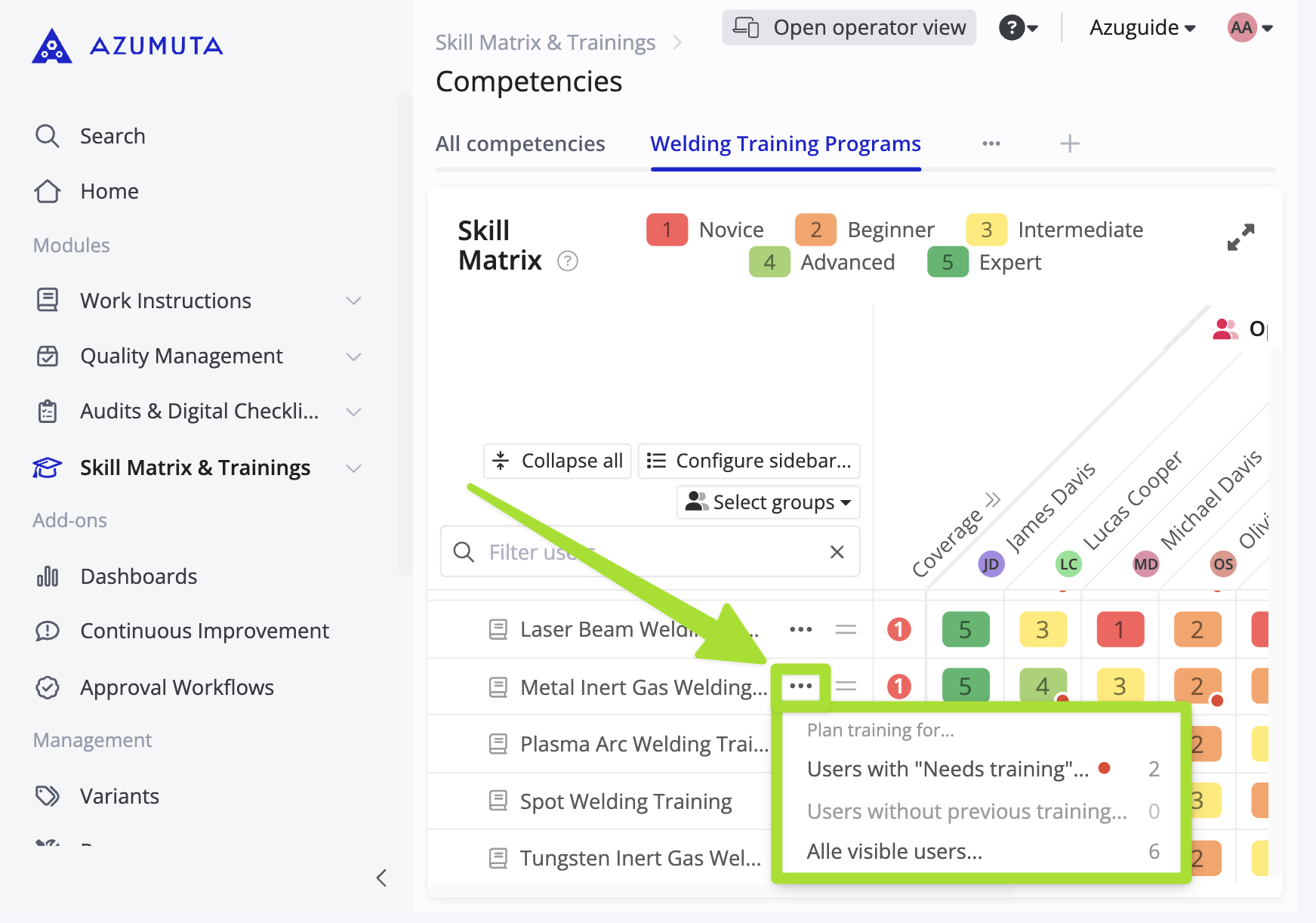 Now, you can plan training activities directly from a skill matrix, eliminating the need to navigate and go through the planning tool. You can even directly select the work instructions that will be used in these training activities.