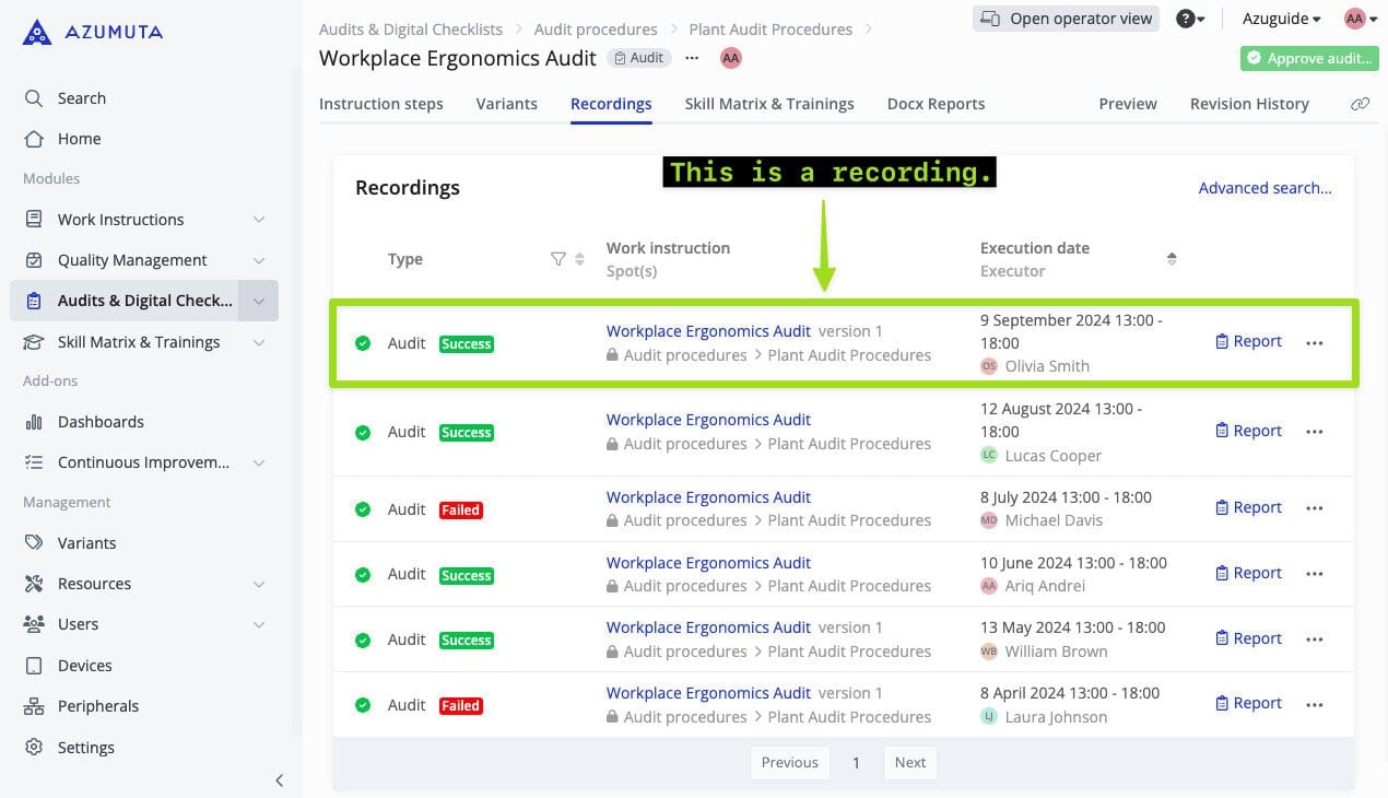 Besides seeing the list of recordings on the module level, you can also see the list of recordings on the audit level. By doing this, you will only see the list of recordings that are linked to a specific audit.