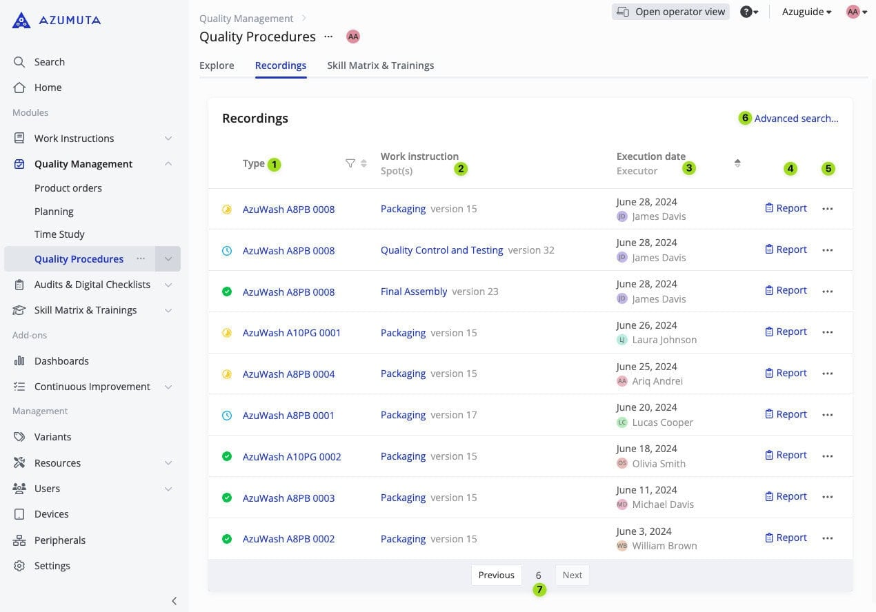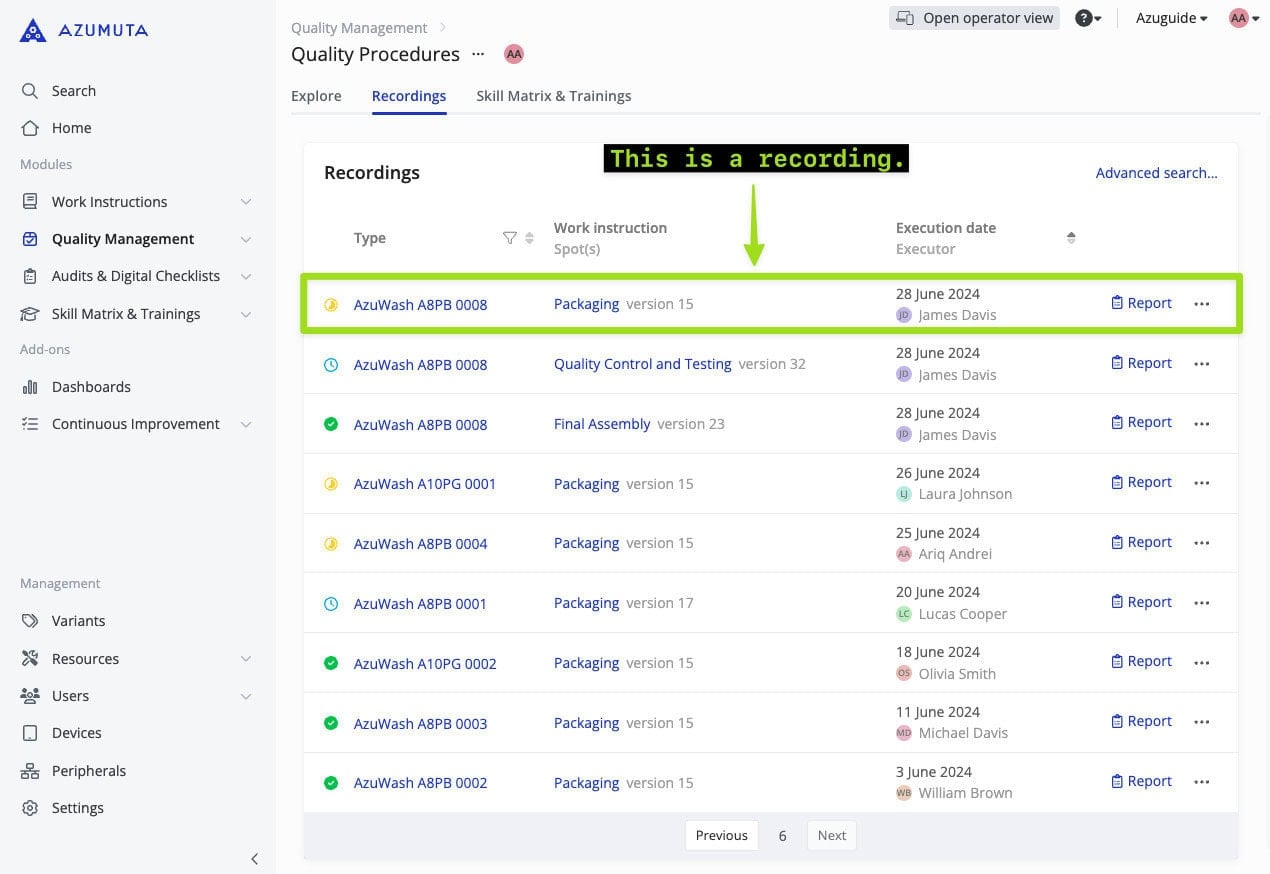 The list of recordings on the work instruction level will have the same interface as the one on the module level.