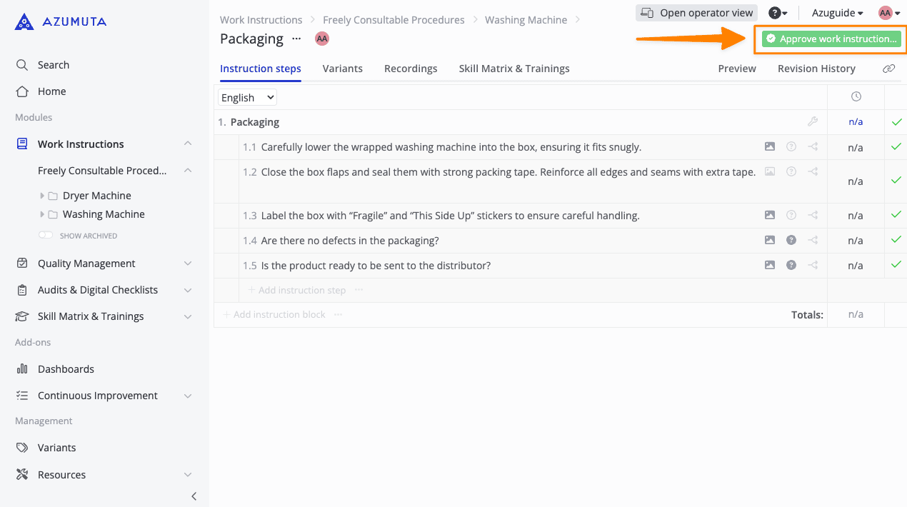 In Azumuta, a work instruction can be changed quickly and easily. When changes are made to a work Instruction, the current version of the work Instruction is automatically saved as “Draft”. This draft version can be converted to a new official version via the approve button, shown below: