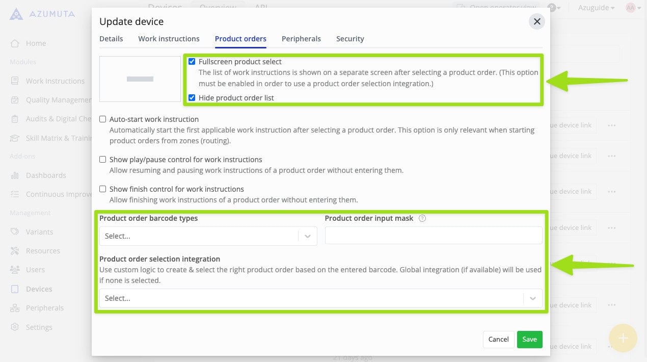 After setting up a Simple Entry Integration in your company settings, update the device settings where you want to use it. Navigate to the Product orders tab, and carefully review the settings highlighted below: