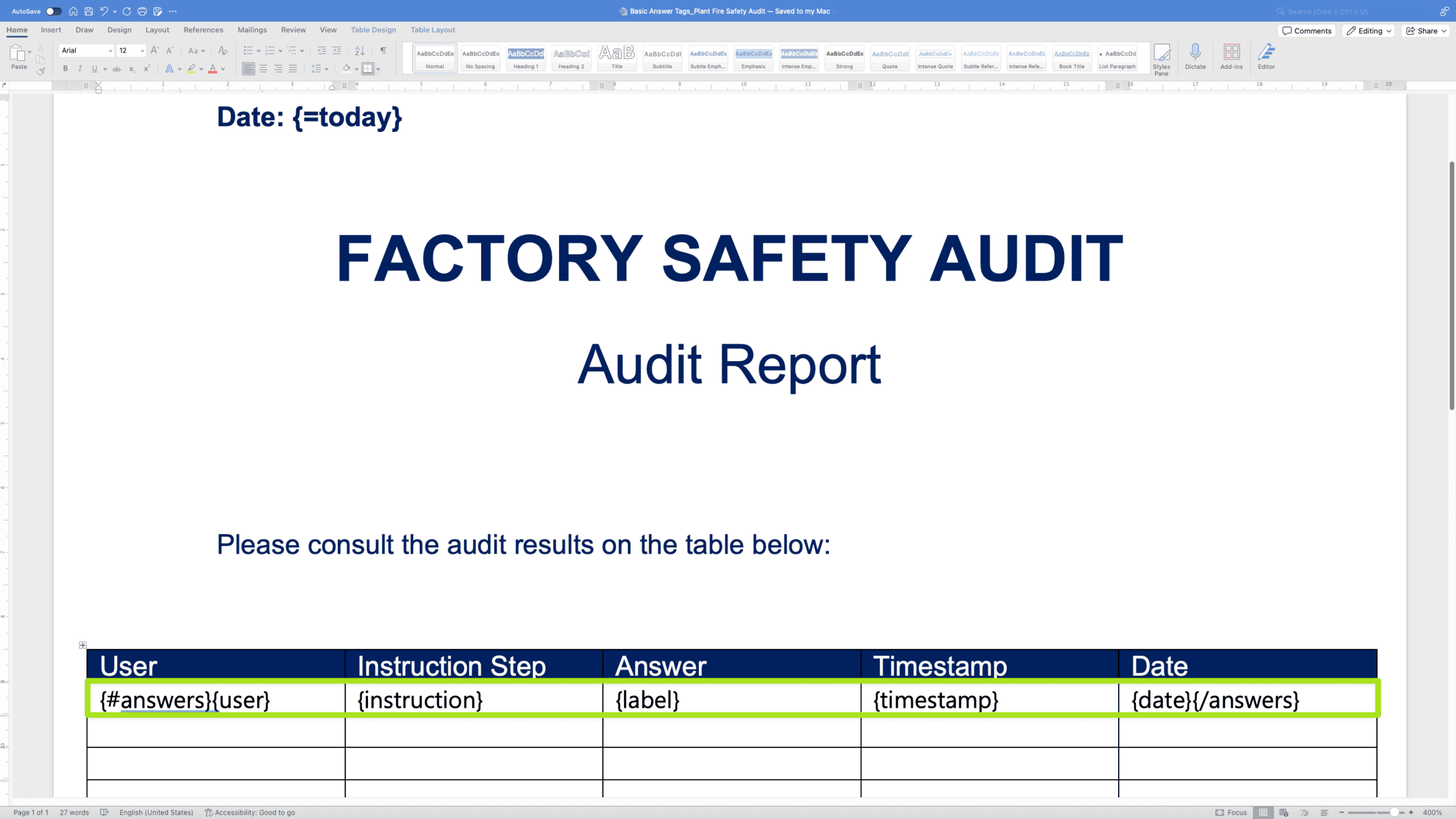 - {answer}: The (unformatted) answer that was given by the operator on the instruction step. We recommend you to use the {label} answer tag instead, as the generated answer on the docx report is more readable.